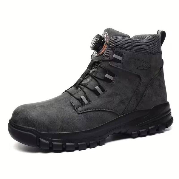 NEW ERA OF WORK BOOTS steel toe, puncture resistant, automatic button, lightweight and comfortable for construction and outdoor use, black with gold details, durable MD heel, all-season wear.